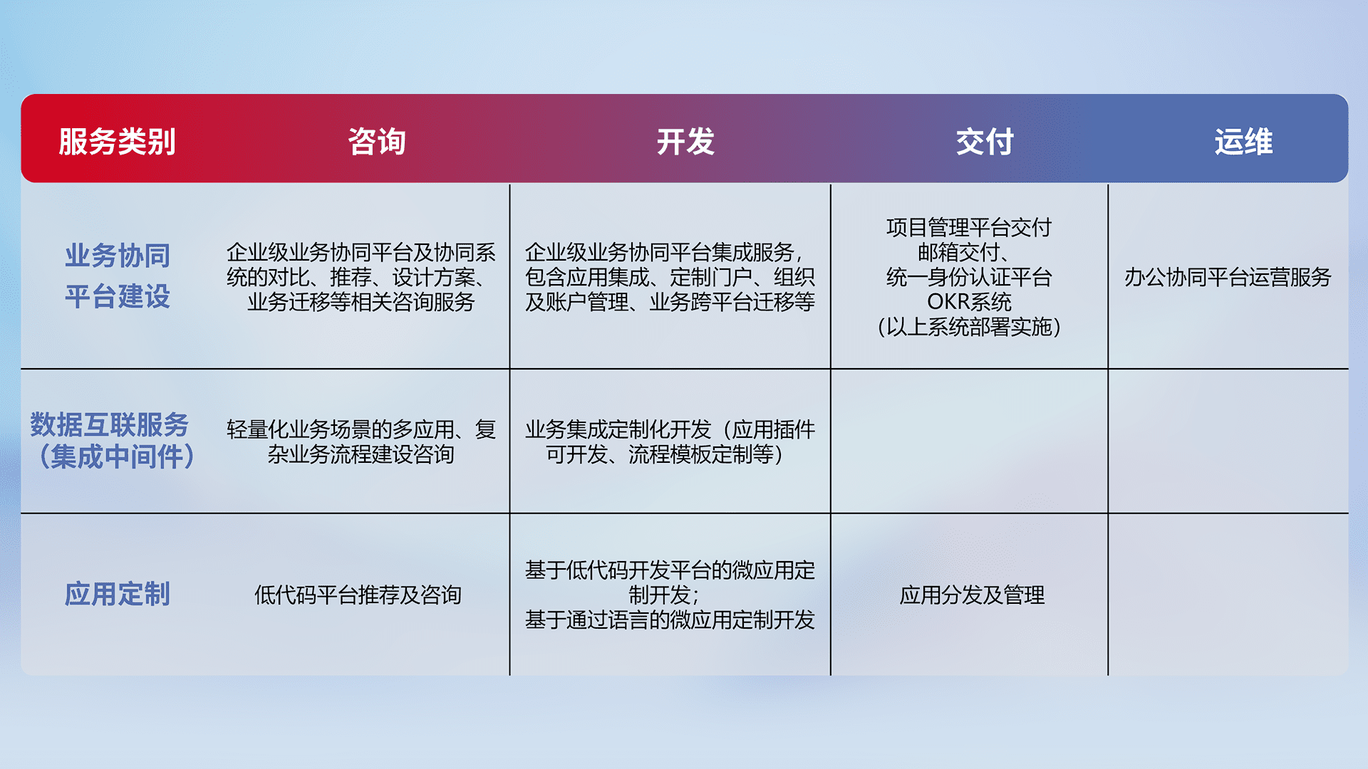 针对钉钉、、、企微、、、、IDaas等平台级产品提供产品的规划、、、、方案、、、交付、、、定制化开发等服务,,,,实现如统一协同办公、、智能客户服务、、、、混合会议管理、、、智能数据查询、、、、等业务场景,,,,实现数字化转型。。。